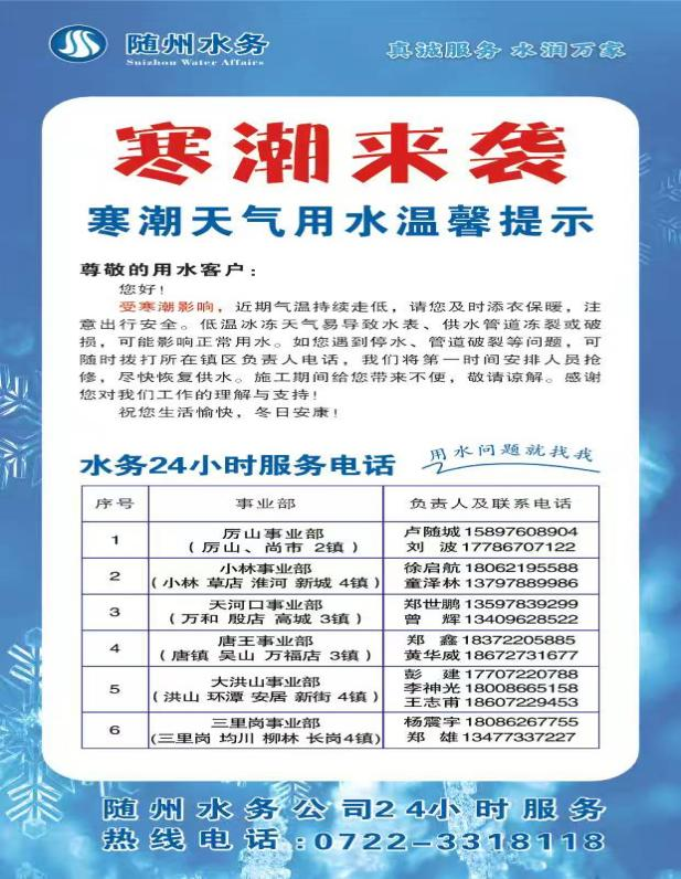 近期,我市持續(xù)遭遇低溫寒潮,嚴寒天氣對城鄉(xiāng)供水管網(wǎng)及設(shè)施構(gòu)成嚴峻挑戰(zhàn),水務(wù)集團隨縣供水公司迅速激活應急響應機制,提前部署筑防線、精準服務(wù)解民憂、全員堅守保暢通的硬核舉措,切實保障居民冬季用水無憂。